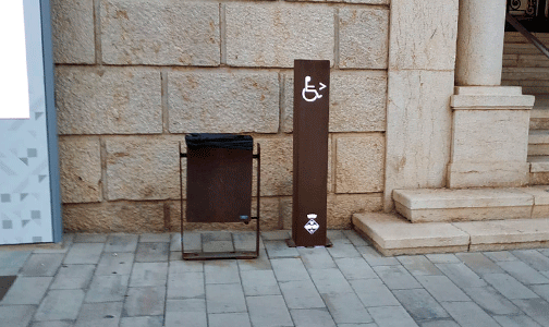 Pilona Info leds lluminosa de disseny elegant construïda amb tub d’acer corten de 200×200 mm. amb icona informativa lluminosa. Punt informatiu lluminós personalitzable segon les necessitats del client.